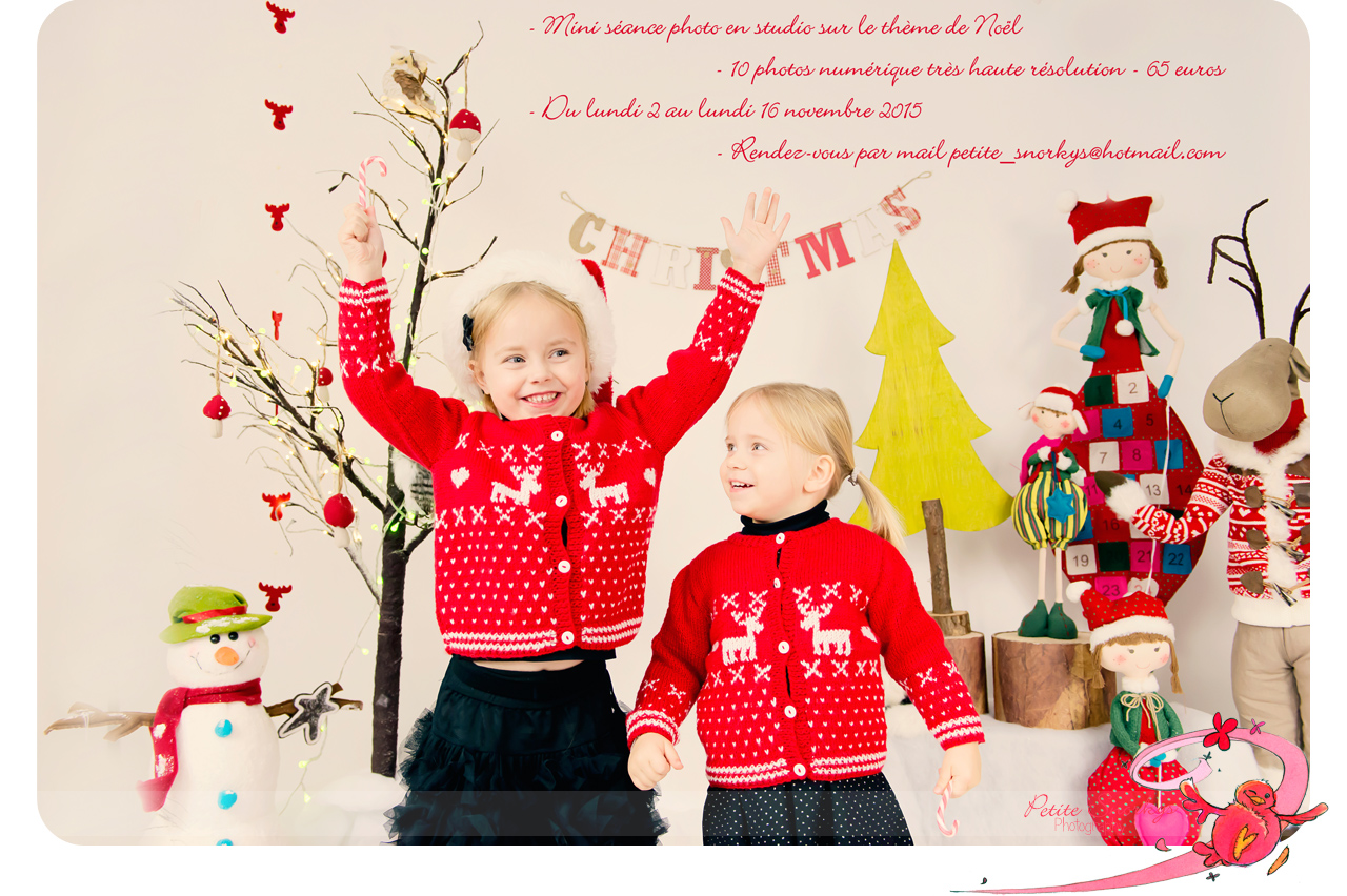Merry Christmas : Réservez dès à présent votre séance photo dans le studio pour les fêtes de fin d’année. Un décor de Noël sera installé dès le 3 novembre jusque NOËL à peu près (réception des images dans les 48h), afin que vous puissiez prendre le temps de réaliser vos cartes de voeux après la réception des photos. Le pack de Noël correspond à une séance de 10 photos très haute définition format numérique, au tarif de 65 euros ou 20 photos 100 euros. Mon studio est situé à 4130 ESNEUX. Le nombre de place est limité, contactez-moi dès maintenant pour réserver la vôtre sur mon adresse mail : petite_snorkys@hotmail.com